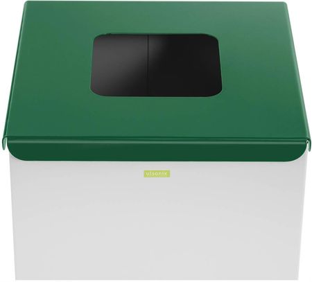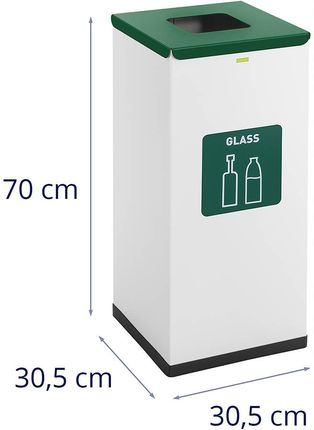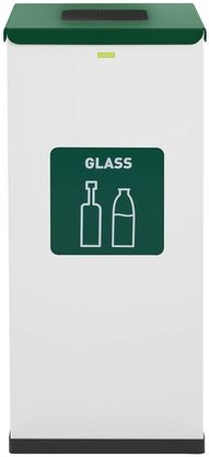 Виготовлений із пофарбованої сталі контейнер для сортування сміття є міцним і простим у обслуговуванні. Завдяки використаному матеріалу та білому кольору він має сучасний вигляд, що робить контейнер придатним для використання в громадських місцях, компаніях, ресторанах і приватних будинках. Продукт орієнтований на сталий розвиток. На лицьовій стороні контейнера є екологічна етикетка та напис, що чітко вказує на призначення (скло) і, відповідно, сортування сміття.