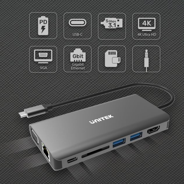 Док станція Unitek Hub USB TYP-C 3.1 8w1 z Power Delivery 100W (D1019B)