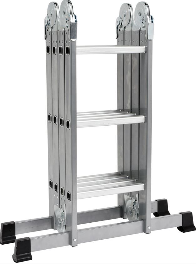 Багатофункціональна драбина 4x3 з максимальною висотою 3,4 м Відповідає вимогам європейського стандарту PN EN131 з навантаженням на сходинку 150 кг. Він складається з чотирьох сегментів, з'єднаних міцними і міцними з'єднаннями. Усі з’єднання мають засувні замки, що дозволяє дуже швидко та зручно змінювати налаштування драбини залежно від ваших потреб. Завдяки цьому його можна розмістити в багатьох положеннях, зокрема: