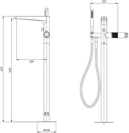 Діапазон виливу: 22 см. Висота виливу води: 87 см. Загальна висота змішувача: 90 см. Латунна душова ручка, 1-функціональний тримач ручки із захисною вставкою. Душовий шланг зі сталевою кришкою, довжина: 150 см. Колекція OMNIRES CONTOUR інтригує своєю екстравагантною формою з грубим і водночас тонким характером. Стриманий, архітектурний візерунок із чітким фрезеруванням вражає вишуканим поєднанням текстур і ідеальної обробки. Змішувач виготовлений з високоякісної латуні та оснащений найякіснішою керамічною головкою. Інноваційні технологічні рішення дозволяють скоротити споживання води вдвічі та забезпечити найвищий комфорт використання.