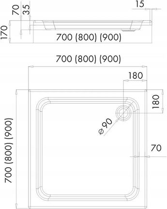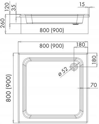 Кат. № 3.012 Довжина 90 см Ширина 90 см Радіус - Висота 26 см Глибина 12 см Форма: квадратМатеріал: санітарний акрилКолір: білий Спосіб монтажу: на підлогуДіаметр зливу: 52ммГарантія: 10 років