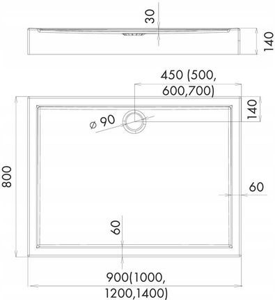 Кат. № 3.0166 Довжина 80 см Ширина 100 см Радіус - Висота 14 см Глибина 3 см Форма: прямокутнаМатеріал: санітарний акрилКолір: білий Спосіб монтажу: на підлогуДіаметр зливу: 90ммГарантія: 10 років