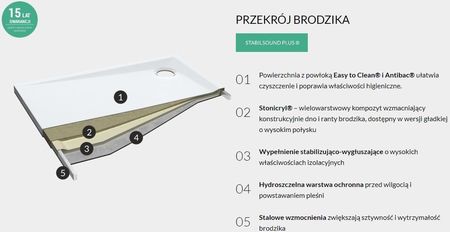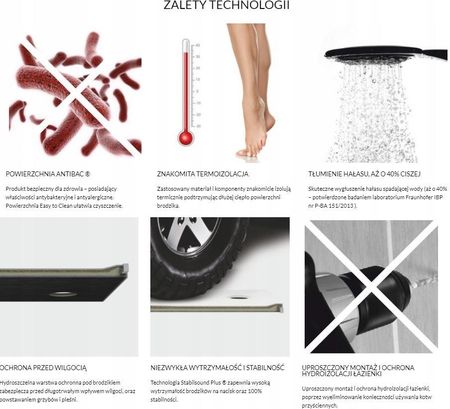 Гідронепроникний захист - довговічність і якість протягом багатьох років, одночасно захищаючи від розвитку грибків, цвілі та розбухання під час використання. З наголосом на довговічності. Завдяки використанню технології Stabilsound Plus® наш душовий піддон може витримувати ще більший тиск. Надзвичайно міцний - Падаюча слухавка, пляшка шампуню чи важкі інструменти? Не хвилюйтеся, наші душові піддони стійкі до будь-яких ударів.