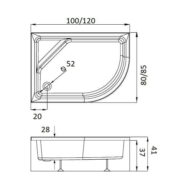 Технічні характеристики: Розмір: 120x85 см Висота: 41 см Глибина: 28 см Діаметр зливу: Ø52 Основа піддону: каркас Піддон комплектується корпусом New Trendy O-0149 Матеріал: акриловий піддон Гарантія виробника: 24 місяці. укомплектовано спеціальним сифоном для душового піддону