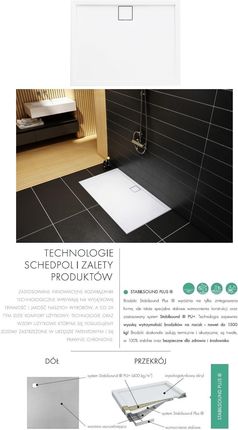 розміри: 90x100x5 см, підлога, діаметр зливу: Ø 90 мм, тип: прямокутний, довжина: 90 см, ширина: 100 см, висота: 5 см, глибина: 1,8 см, система STABILSOUND PLUS ® - металева підсилювальна конструкція та ПУ + система спінювання, матеріал: композит Stonicryl®, колір: білий, в комплект входить багатошарова спеціальна акрилова пластина, що маскує відтік води (легко піднімається і опускається), в комплект входить: сифон 90 мм (очищений зверху, висота 6 см, потік 51,6 л/хв, манжета , фланець з нержавіючої сталі, перехідне коліно 40/50 мм), установка: в або на підлозі, покриття: Easy to Clean і Antibac, ГАРАНТІЯ 15 років.