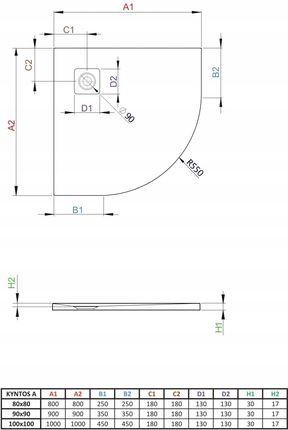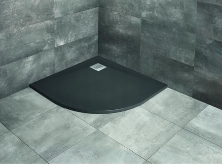 Radaway HKA9090-74 KYNTOS Напівкруглий душовий піддон 90x90 антрацит з мармурового конгломерату. Душові піддони серії Teos і Kyntos виготовлені з мармурового конгломерату, матеріалу, що характеризується чудовими функціональними властивостями та естетичними цінностями. Цей матеріал стійкий до різного роду забруднень, зміни кольору та стирання. Структурована поверхня STONE має протиковзкі властивості, що забезпечує безпеку під час використання. Конструкція душових піддонів гарантує їх легку установку безпосередньо на підлогу або їх можна вбудувати в підлогу, щоб душовий піддон був на одному рівні з підлогою.