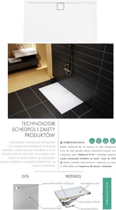 розміри: 90x140x5 см, підлога, діаметр зливу: Ø 90 мм, тип: прямокутний, довжина: 90 см, ширина: 140 см, висота: 5 см, глибина: 1,8 см, система STABILSOUND PLUS ® - металева підсилювальна конструкція та ПУ + система спінювання, матеріал: композит Stonicryl®, колір: білий, в комплект входить багатошарова спеціальна акрилова пластина, що маскує відтік води (легко піднімається і опускається), в комплект входить: сифон 90 мм (очищений зверху, висота 6 см, потік 51,6 л/хв, манжета , фланець з нержавіючої сталі, перехідне коліно 40/50 мм), установка: в або на підлозі, покриття: Easy to Clean і Antibac, ГАРАНТІЯ 15 років.