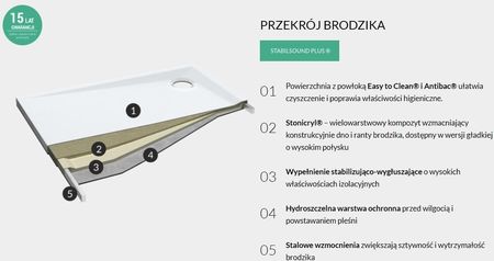 Сифон, прихований у підлозі. Для обраної моделі потрібне місце для сифона в підлозі ванної кімнати. Ідеальна форма. Відповідні конструктивні ухили по всій поверхні душового піддону гарантують належний відведення води. Швидка та проста збірка Збірка, яку може виконати одна людина. Універсальний дизайн Душовий піддон підходить для всіх кабін з однаковими зовнішніми розмірами. Вирізання за розміром. Можливість індивідуального вирізання форми душового піддону - щоб відповідати незвичайному душовому простору Висока міцність Стійкість до падінь, ударів і підвищеного тиску. Легко чистити Завдяки технології Easy to Clean ви можете легко підтримувати його в чистоті. 100% стабілізація. Стабільна конструкція забезпечує безпеку використання вище середнього. Жодного свердління чи анкерування. Чисте встановлення без спеціальних аксесуарів чи інструментів. Відповідає європейським стандартам. Ви можете бути впевнені, що наш продукт відповідає всім необхідним європейським вимогам і стандартам. FCKW Без фреону? Це не тут. Наш продукт не містить шкідливих речовин, які руйнують озоновий шар. Відкрийте для себе технологію комфорту1. Попрощайтеся з брудом і бактеріями – поверхня, яку легко мити (Easy to Clean), також має антибактеріальні властивості (Antibac®)2. Забудьте про холод і шум - ізоляційне наповнення запобігає втраті тепла і забезпечує комфорт під ногами і зниження шуму.3. Багатошарове зміцнення – композитний матеріал Stonicryl® зміцнює дно та краї душового піддону.4. Водонепроникний захисний шар – захист від вологи та утворення цвілі.5. Сталеві арматури – підвищують жорсткість і довговічність.6. Кришка під колір душового піддону