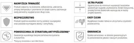 Висока стійкість до зміни кольору, ударів, подряпин і тріщин Властивості, що послаблюють звук падаючої води Комфортна температура поверхні під час купання Стійкість до вологи та цвілі Вища хімічна та термічна стійкість Тривалий термін служби Легка вага для простого встановлення