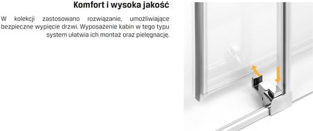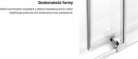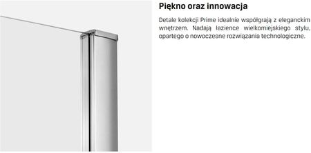 КРАСА ТА ІННОВАЦІЇ Деталі колекції Prime чудово поєднуються з інтер'єром ванної кімнати. Вони надають йому столичного стилю, збагаченого сучасними технологічними рішеннями. Елементи, що кріплять кабіну до стін душової зони, виготовлені з високоякісного металу. НОВІТНІ ТЕХНОЛОГІЇ У ВАННІЙ Бігова доріжка мінімалістичної форми має інноваційну систему ковзання. Подвійні ролики, розташовані у верхній частині виробу, забезпечують плавне відкриття дверей. Система має кришку, яка запобігає їх випаданню, коли вони розстібаються.
