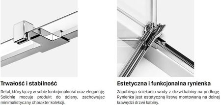 Естетичний і функціональний жолоб - запобігає капанню води з дверей кабіни на підлогу. Жолоб – це естетична планка, яка монтується на нижньому краю дверей кабіни. Міцність і стійкість - деталь, яка поєднує в собі функціональність і елегантність. Він надійно кріпить виріб на стіні, зберігаючи мінімалістичний характер колекції. Витончена форма - елегантний настінний профіль забезпечує стійкість виробу. Форма де