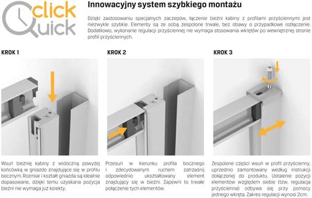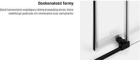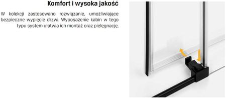 Досконалість форми Деталь гармонійно поєднується з нижнім краєм дверей, що стабілізує її при відкриванні та закриванні. Комфорт і висока якість У колекції використовується рішення, яке дозволяє безпечно від'єднати двері. Оснащення кабін системою такого типу полегшує їх установку та обслуговування. Інноваційна система швидкого складання Завдяки використанню спеціальних гачків з’єднання рейок кабіни з стіновими профілями відбувається надзвичайно швидко. Елементи міцно з'єднані між собою, не боячись випадкового роз'єднання. Крім того, для регулювання стіни не потрібно використовувати гвинти на внутрішній стороні стінових профілів.