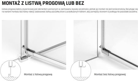 Встановлення з пороговою планкою або без неї Порогова планка душової кабіни є елементом, який допомагає зберегти кращу герметичність, але її встановлення не є обов’язковим. Якщо ви вирішите встановити варіант без планки, використовуйте нижній ущільнювач дверей з подовженим полотном, щоб не було зазору між дверима і підлогою. Порогова планка і додатковий ущільнювач входять в комплект з іншими деталями душова кабіна. ↓ Щоб дізнатися більше, натисніть на зображення нижче ↓