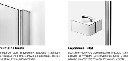 Душова кабіна REFLEXA Простий, але цікавий дизайн виробу забезпечує його цікавий зовнішній вигляд, доповнений високою якістю матеріалів та виготовлення. Загартоване скло доповнено ніжними, але стійкими профілями та елегантним кронштейном, який, крім функціональної функції, є декоративним акцентом у будь-якому інтер’єрі. Хромовані ручки ідеально поєднуються з формою кабіни, завдяки чому виріб виглядає неповторно як в традиційних, так і в сучасних ванних кімнатах. Елегантна хромована ручка - двостороння ручка ергономічної форми, що дозволяє комфортно користуватися виробом. Модний дизайн підкреслює сучасний декор ванної кімнати.