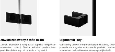 Петлі з функцією підйому - це означає, що двері піднімаються під час відкривання та закривання. Завдяки цьому ущільнювач, розташований на їх нижньому краю, не треться об землю під час роботи. Рішення не тільки полегшує використання виробу, але й продовжує термін служби самої пломби. Петля виготовлена з металу, що забезпечує її довговічність. Петля розташована врівень зі склом, що доповнює елегантний дизайн колекції. Гладка однорідна поверхня виробу дозволяє легко підтримувати його в чистоті.