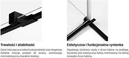 Естетичний і функціональний жолоб - запобігає капанню води з дверей кабіни на підлогу. Жолоб – це естетична планка, яка монтується на нижньому краю дверей кабіни. Міцність і стійкість - деталь, яка поєднує в собі функціональність і елегантність. Він надійно кріпить виріб на стіні, зберігаючи мінімалістичний характер колекції. Витончена форма - елегантний настінний профіль забезпечує стійкість виробу. Форма деталей робить ванну кімнату ексклюзивною та сучасною.