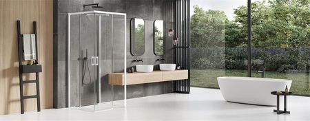 Душова кабіна PRIME WHITE Колекція поєднує столичний стиль із сучасними технологічними рішеннями. Prime White має вишукані білі деталі та характерну розсувну систему, яка забезпечує плавне відкривання дверей. Використання інноваційного механізму позбавляє від необхідності встановлення нижньої гусениці. Завдяки цьому Prime White - це поєднання досконалого дизайну та ергономічного виконання. Елементи кріплення кабіни до стінок душової виготовлені з високоякісного металу. Кольори фурнітури в цих колекціях наносяться порошковим методом. Завдяки цьому вони характеризуються ідеально гладкою, матовою поверхнею.