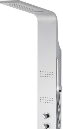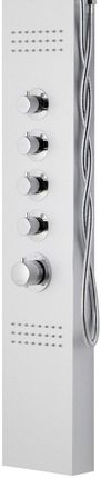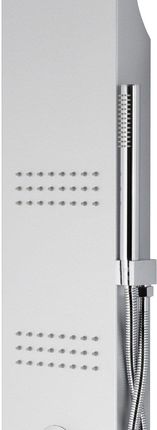 Корпус панелі: виготовлений з напівматової поверхні. Душова панель має прядену форму - формований алюміній. Завдяки цьому панель ніколи не протікає (немає склеєних сторін) - надає блискучий блиск, а завдяки високому вмісту хрому панель стійка до високих температур. Ефектне хромоване покриття (змішувачі, трубка, тропічний душ) підкреслює та збагачує панель. Ми використовуємо хромовану сталь, а не хромований пластик, тому обробка всіх панелей (ручки, ручний душ) не стирається під час використання.