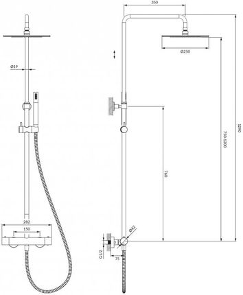 Колір хром Особливості потоку термостатичний змішувач для душу, блокування гарячої води при 38°C, латунний тропічний душ, розмір: ø 25 см, відстань від стіни: 35 см, латунна душова ручка, 1 функція, душовий шланг у сталевому чохлі, довжина: 150 см , тропічний душ/перемикач струменю ручки, вбудований у ручку регулювання води, регульована висота, мінімальна/максимальна висота системи: 75 см/120 см