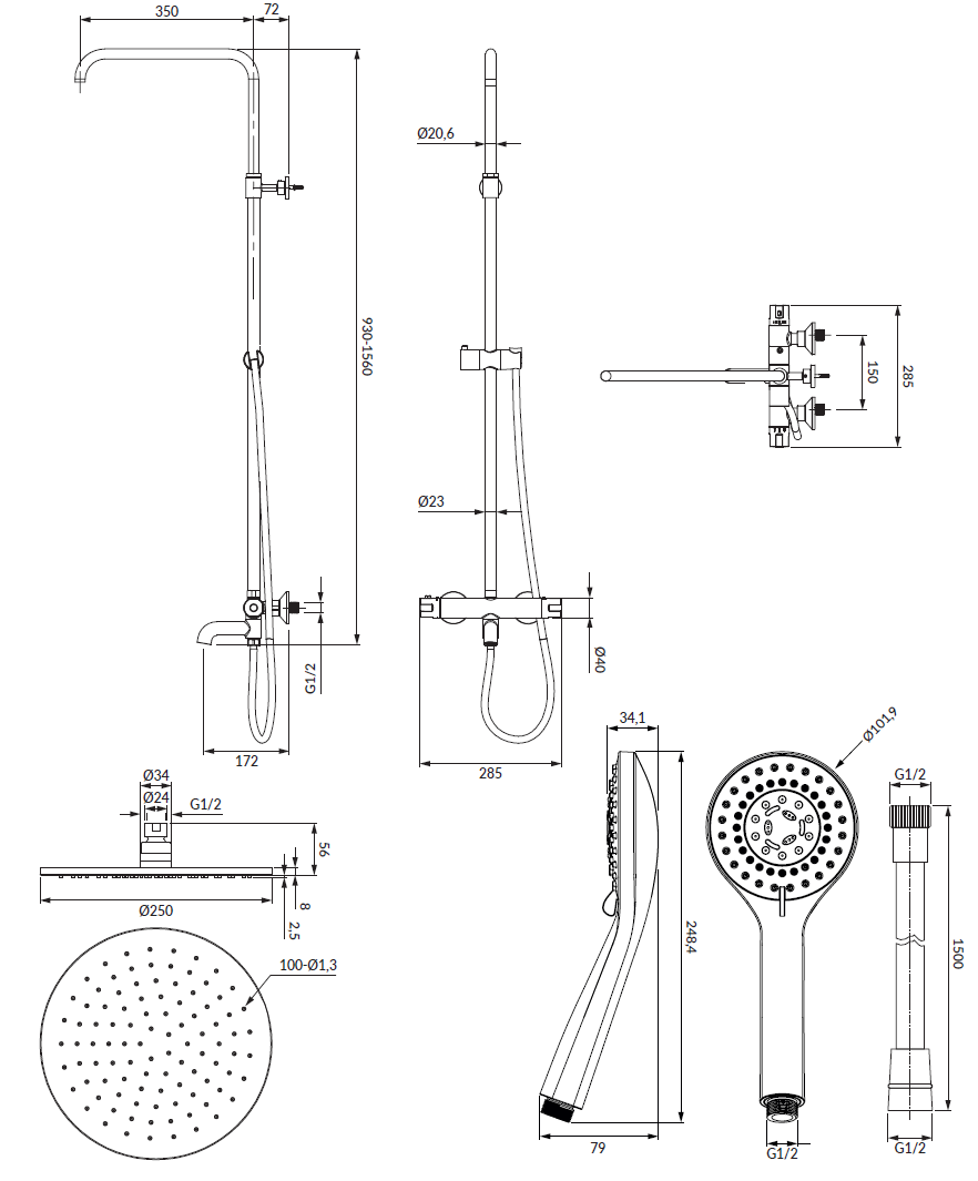ТЕХНІЧНІ ХАРАКТЕРИСТИКИ Термостатичний змішувач для ванни, блокування гарячої води при 38°C, система охолодження корпусу змішувача запобігає опіку в разі випадкового дотику, латунний тропічний душ (WG125GL), розмір: ø25 см, відстань від стіни: 42 см , ручний душ (YOSEMITE-RGL), 5 функцій, тип струменя: масаж, туман, дощ, аерований масаж, аерований душовий шланг із сталевим покриттям (023-XGL), довжина: 150 см тропічний душ/перемикач струменя вбудований у ручку регулювання води регульована висота, мінімальна/максимальна висота системи: 93 см/156 см