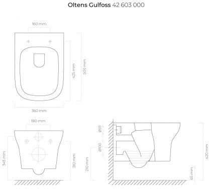 підвісний унітаз із традиційним зливним фланцем, довжина 50 см, ширина 36 см, висота 36 см, відстань між кріпильними гвинтами 180 мм, невидима стіна для кріплення "Сліпе встановлення" вага 20,3 кг, білий колір із покриттям Oltens SmartClean