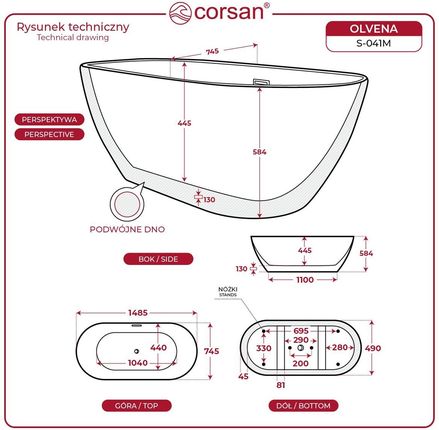 Ванна Corsan OLVENA E041ME Ексклюзивна, окремо стояча, акрилова, універсальна. Розміри ванни Corsan Olvena: ширина - 74,5 см, довжина - 58,4 см, вага - 25 кг. Красива і зручна окремо стояча ванна від CORSAN. Olvena – відмінний вибір для тих, хто хоче розкоші та елегантності у своїй ванній кімнаті. Витончена з увагою до найдрібніших деталей, ванна виправдає очікування навіть найвимогливіших клієнтів. Округлі лінії створюють сучасний дизайн, який зробить щоденне купання неймовірним задоволенням. Ідеально продумана форма забезпечує неймовірне розслаблення та розслаблення. Важливою перевагою ванни Corsan Ovena є, безсумнівно, те, що її можна розмістити у ванній кімнаті з мінімалістичним оформленням, характерною для скандинавських країн, промислових приміщеннях або сучасних ванних кімнатах яскравих кольорів. Завдяки цьому, незалежно від Вашого бачення ванної кімнати, Ви можете легко використовувати ванну Corsan Olvena.