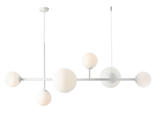 Світильник Dione 6-точковий підвісний, білий,_x000D_ з регульованою висотою 110 см і шириною 130 см ідеально підходить для..._x000D_ будь-яка більша кімната простих і легких форм. Сучасний_x000D_ Модель Aldex поєднує в собі естетичну обробку з непідвладним часу матеріалом_x000D_ і колір. Латунь додасть інтер'єру елегантності і трохи чуттєвості, а білий - елегантності_x000D_ сферичні абажури гарантують, що він не перевантажить навіть спальню._x000D_ Навколо білого кронштейна світильника розміщені кульки з матового скла._x000D_ Лампа оснащена шістьма джерелами світла - чотирма лампочками з різьбленням Е14 в кульках_x000D_ менші діаметром 14 см і дві лампочки з різьбленням Е27 в більших кульках_x000D_ діаметр 20 см. Максимальна потужність лампочки 60 Вт.