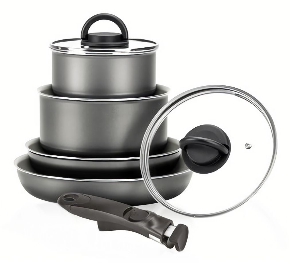 Набір посуду Melodia Minispace із 7 предметів. складається з 4 корпусів, 2 кришок і знімної пластикової ручки. Нижня чиста індукція. Система кріплення Twin Block. Покриття FineGres