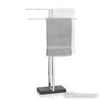 Вішалка для рушників Menoto від німецького бренду Blomus. Він виготовлений з полірованої нержавіючої сталі та розміщений на основі з пластику, що імітує натуральний камінь. Підставка має простий дизайн без зайвих доповнень.