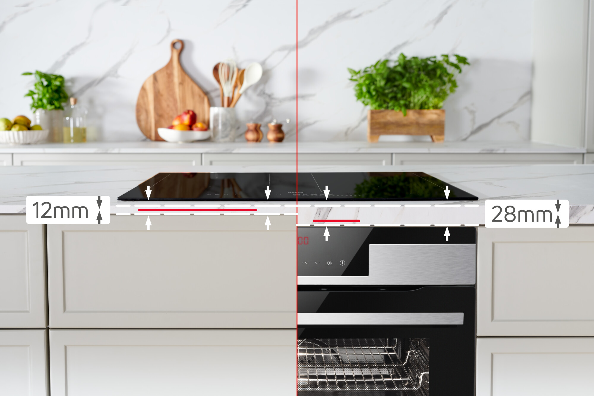 Облаштування кухні відповідно до останніх тенденцій? Так, якщо ви виберете універсальну індукційну плиту Amica! Ви можете встановити його практично на будь-яку стільницю - навіть на ту, яка має товщину лише 12 мм над висувним ящиком, або на стільницю 28 мм над духовкою Amica. Сучасний дизайн варильної панелі не вимагає використання передньої вентиляції або перегородки, тому ви можете використовувати простір під плитою по максимуму. Там можна зберігати навіть гострі аксесуари, адже дно тарілки додатково захищене. Все це означає гнучкість у дизайні кухні, комфорт використання та унікальний дизайн.